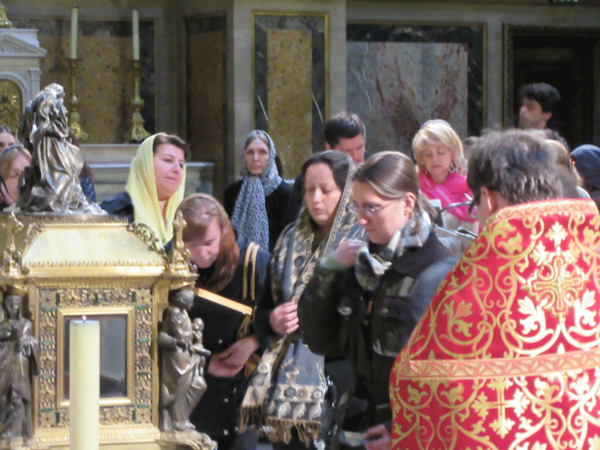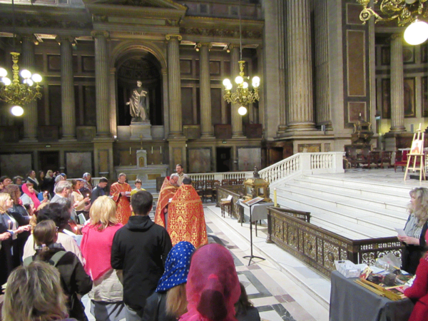 В Неделята, когато Православната Църква отдава почит на жените миронисици, благодарение на които вестта за Христовото Възкресение е достигнала и до апостолите и до нас, енориаши от Българската православна църковна община в Париж « Свети патриарх Евтимий Търновски » с благословението на Западно- и средноевропейския митрополит Антоний, имаха радостта да се поклонят на една от тях – света Мария Магдалина. В едноименната катедрала във френската столица, където се съхранява част от бедрената ѝ кост, бе отслужен пасхелен православен молебен и акатист към равноапостолната, възглавени от отец Николай Никишин от Кoрсунската епархия на Московската патриаршия, който извърши молитвеното последование в съслужение с отец Георги Егоров и отец Иван Карагеоргиев.